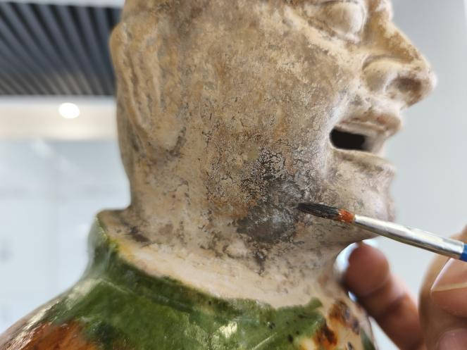 实操修复的第一步是清理。侍传军说,“这批唐三彩出土于济南樊家遗址唐代朱满墓,因为长时间埋于地下,器身均带有泥土附着物,对此我们会用2A溶液进行清理,另外还会用到毛刷、棉签等工具。”