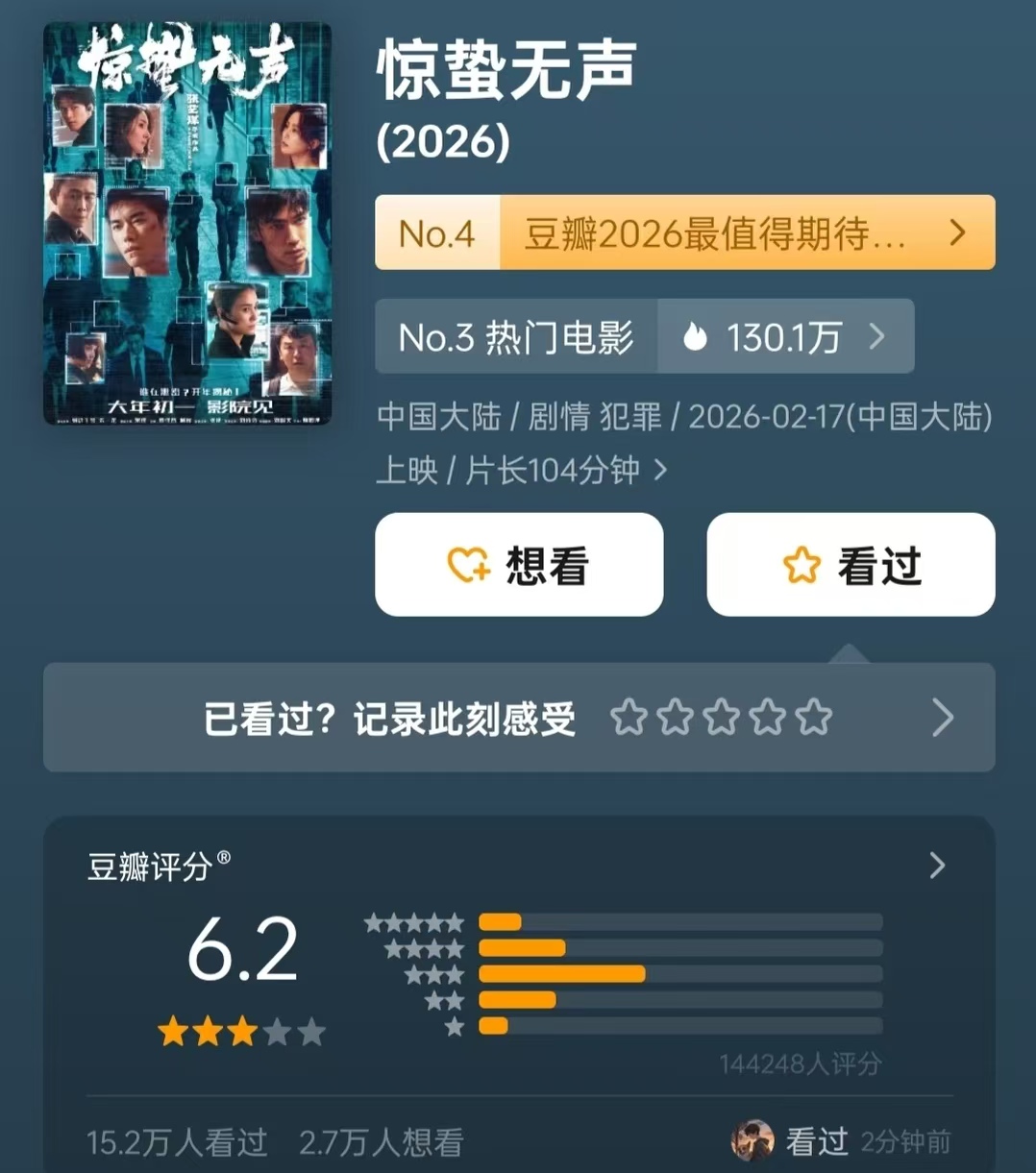 3月5日惊蛰当天,张艺谋执导的国安题材电影《惊蛰无声》传来票房捷报——累计票房成功突破11亿,成为今年春节档中表现不俗的商业片。但与此同时,这部影片的口碑却呈现出两极分化的态势,在豆瓣平台仅拿到6.2分的评价,引发网友热议。