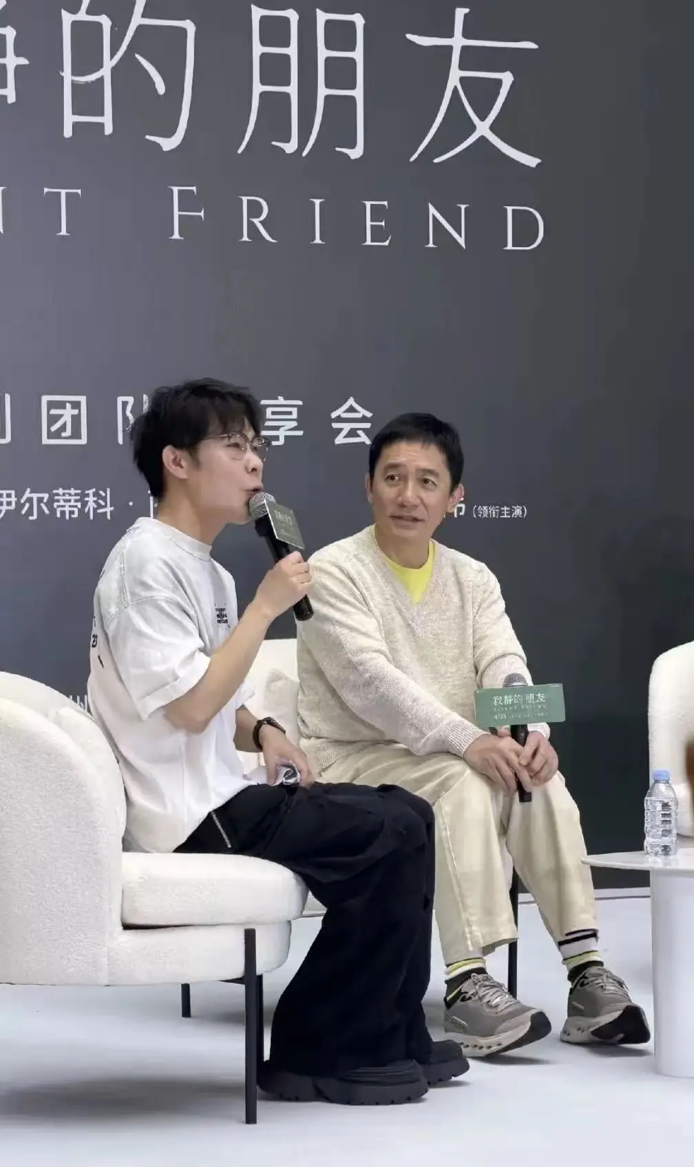梁朝伟在台上有些拘谨,他穿一身米白色套装,双脚脚尖都是内扣的姿势,甚至紧张到搓手指。