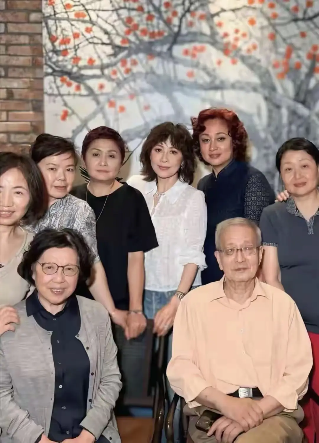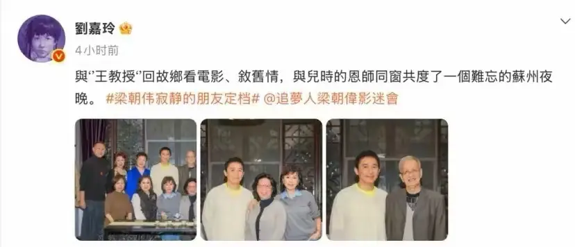 刘嘉玲带影帝老公参加同学会,她和师母坐前排,梁朝伟和师父站在后排,夫妻俩都是照片的C位。