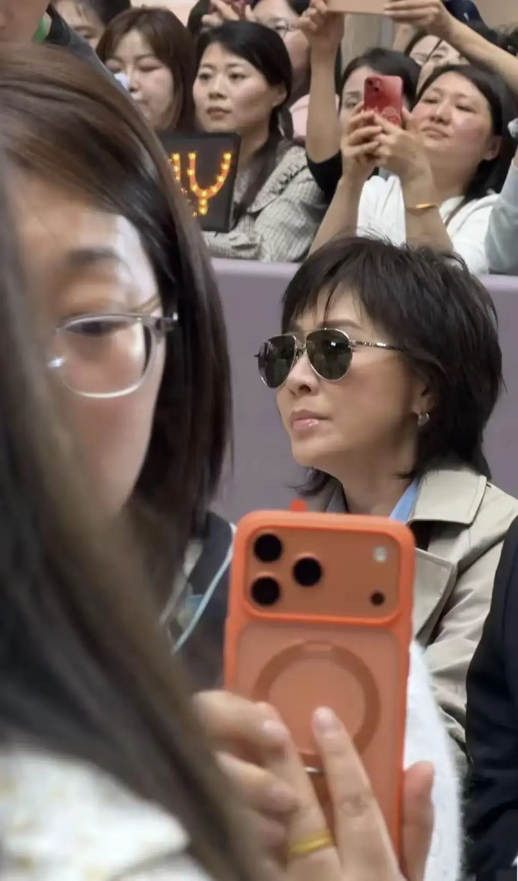 坐在台下看着老公,抱着爆米花的手上戴着超大超闪的钻戒。周围的人都举着手机拍照,只有她满眼都是老公。