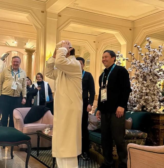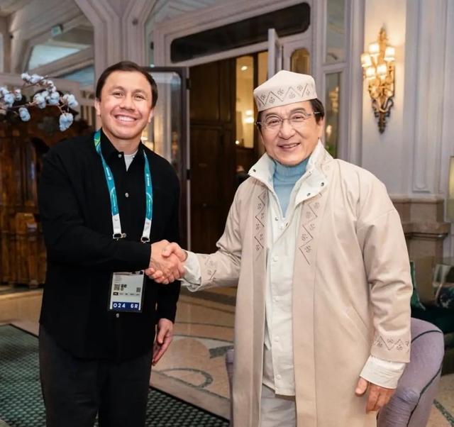 成龙还入乡随俗的换上了当地的特色服饰,带着特色刺绣的浅咖色外套,还有同款帽子,感觉跟新疆那边的服饰也比较相似。