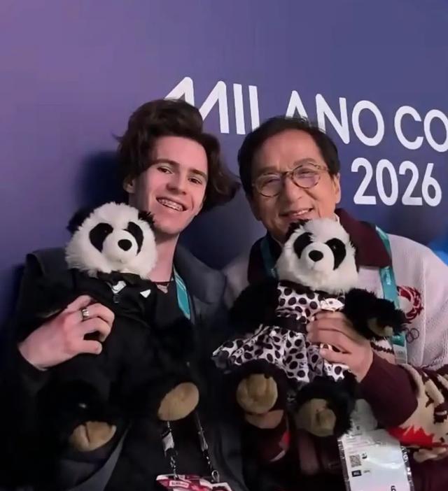 萨多洛夫穿的也是熊猫款的服饰,两个人拿着熊猫玩偶,这个画面还真是有趣。成龙笑意满满、越老越慈祥。