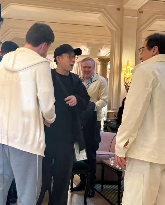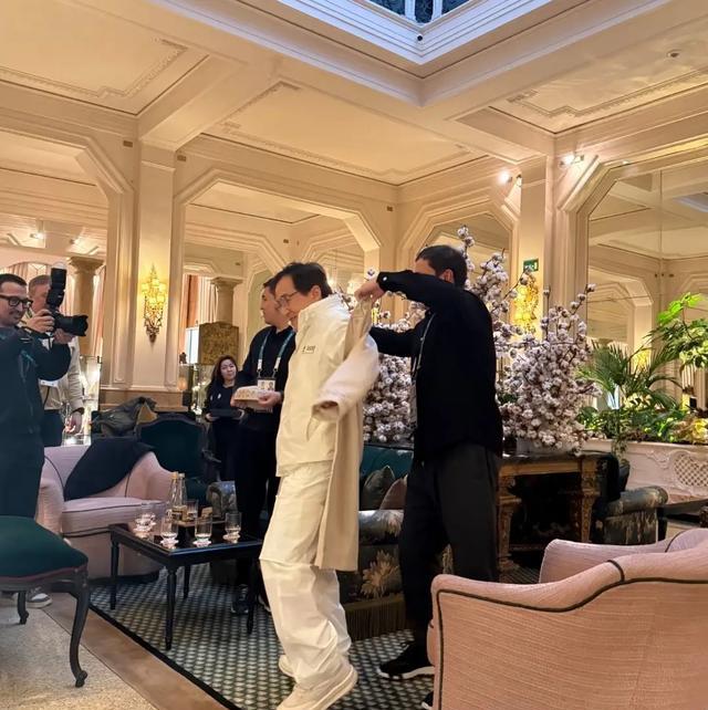 有人举着手机拍照,也有人忙着帮成龙整理衣服。大家都乐得合不拢嘴,现场的氛围很快乐,就像是一场老朋友的聚会。