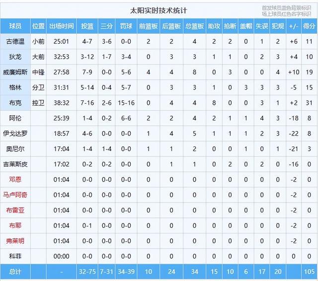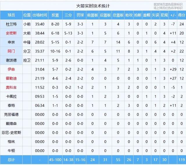 数据:杜兰特24分4板3助、阿门22分11板8助3断、史密斯20分6板、申京12分14板6助、伊森12分7板2助3断、谢泼德12分5板、霍勒迪12分、卡佩拉2分3板、泰特2分2板3助;布克31分4板8助、威廉姆斯19分8板3断、格林15分3板3帽、古德温11分4板2助2断、狄龙10分3板、伊戈达罗8分5板、阿伦8分4板2助、奥尼尔3分2板。